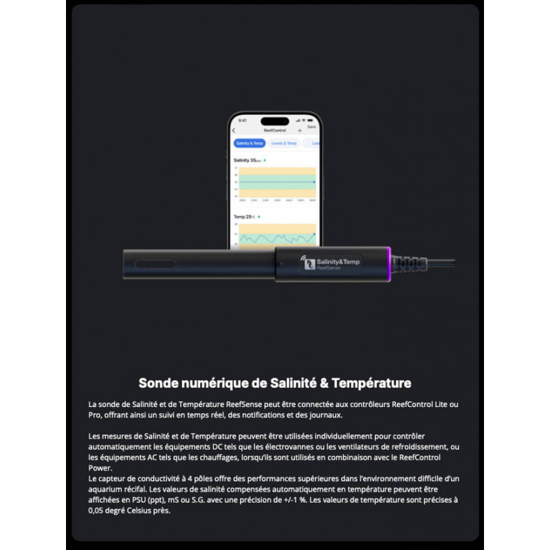 Elle permet un suivi en temps réel de la salinité et de la température de l’eau, deux paramètres essentiels pour la stabilité et la santé des aquariums récifaux. Grâce à sa technologie avancée et son intégration complète dans l’écosystème Red Sea, elle assure des mesures fiables, cohérentes et faciles à consulter.