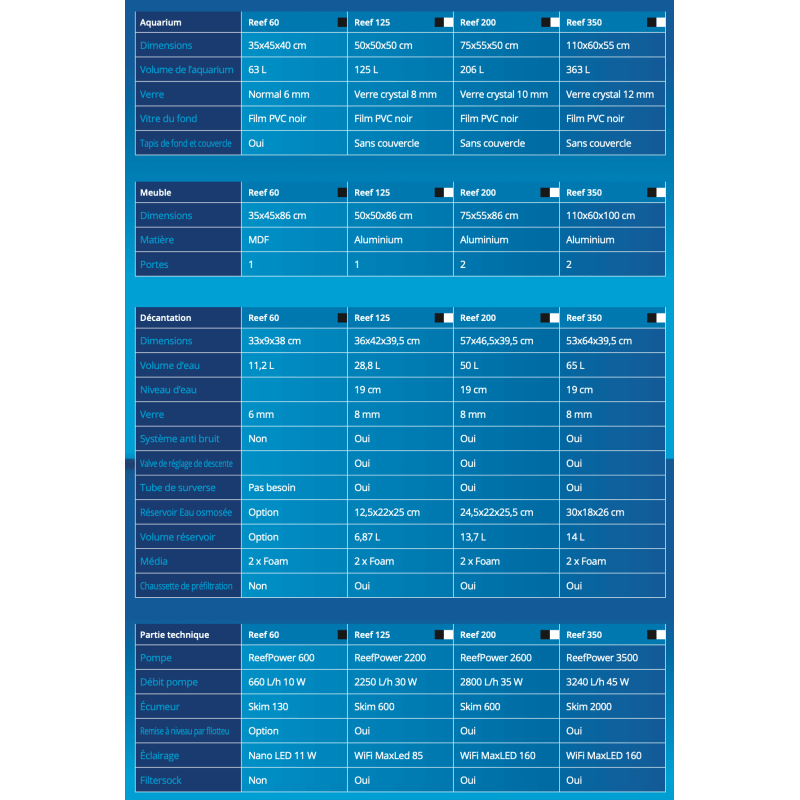 Aquariums 363L de volume réel + 65L de décantation nouvelle génération, développés grâce à une longue expérience professionnelle dans le récifal.