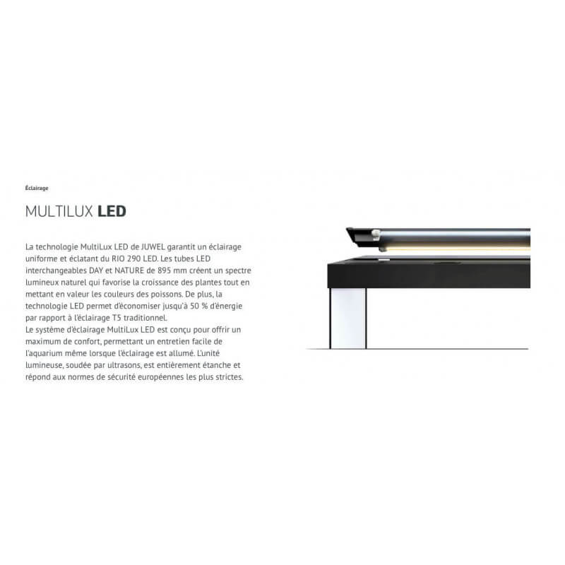 Un éclairage brillant et une croissance magnifique des plantes : voilà ce qu'offre MultiLux, la technologie d'éclairage moderne LED de JUWEL. Les tubes LED interchangeables DAY et NATURE créent un spectre lumineux optimal tout en permettant des économies d'énergie de jusqu'à 50% par rapport au modèle T5.