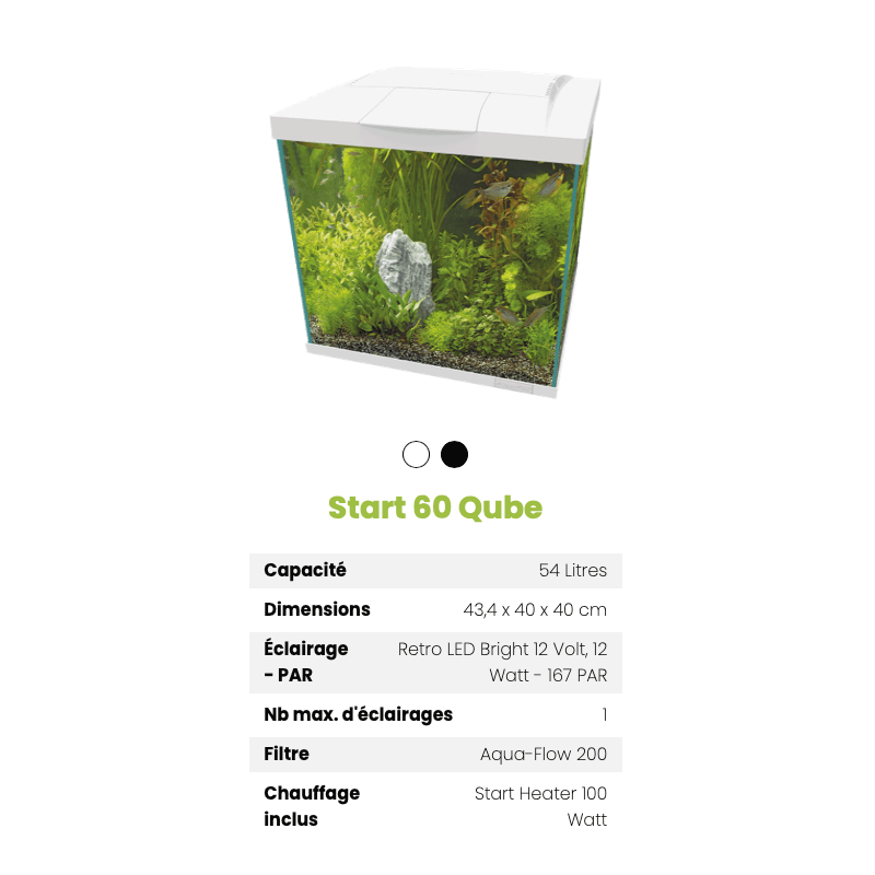 Le Superfish Start 60 Qube Kit Noir est un aquarium d’aquariophilie complet de 54 L pensé pour les débutants ou pour une installation simple et rapide chez soi. Il regroupe l’essentiel pour démarrer facilement un aquarium d’eau douce avec éclairage, filtration et accessoires inclus.