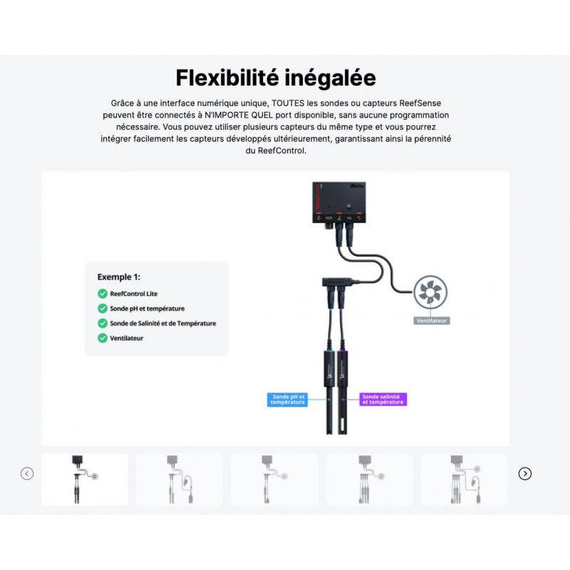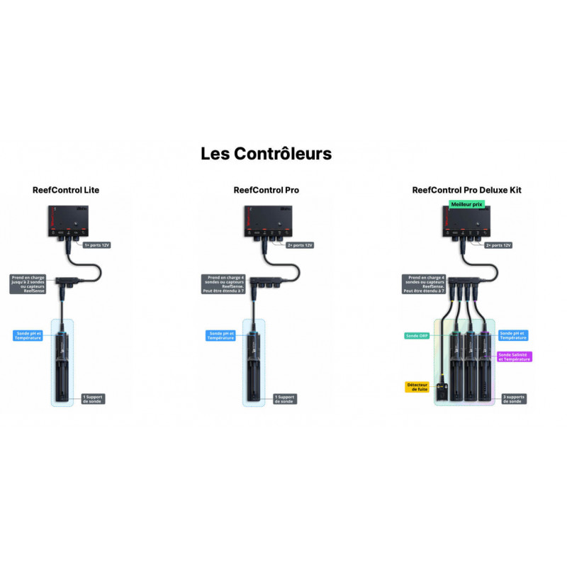 Ces systèmes Reefcontrol sont disponibles en 3 versions, livrés avec plus ou moins de sondes et capteurs et pouvant accueillir pour la plus grosses version avec extension jusqu'à 7 outils de mesures.