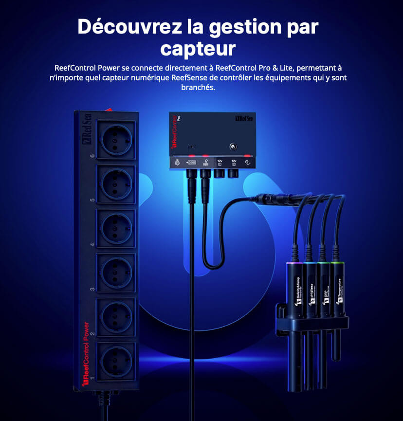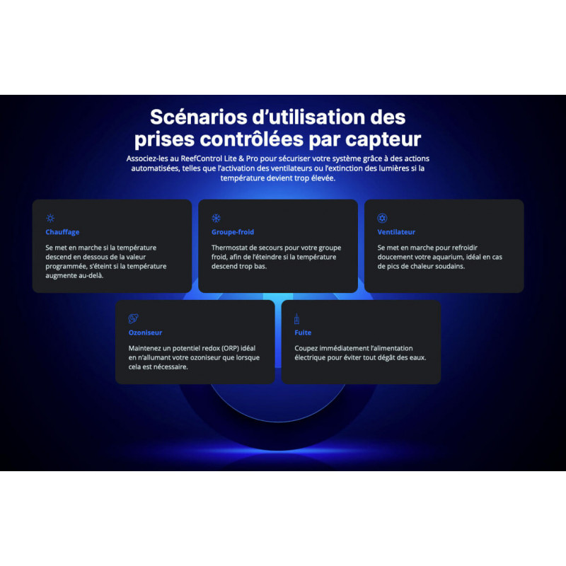 Il dispose de plusieurs prises AC intelligentes, pilotables en fonction des mesures fournies par les contrôleurs ReefControl Lite et ReefControl Pro : température, pH, salinité, ORP, niveau d’eau, etc.