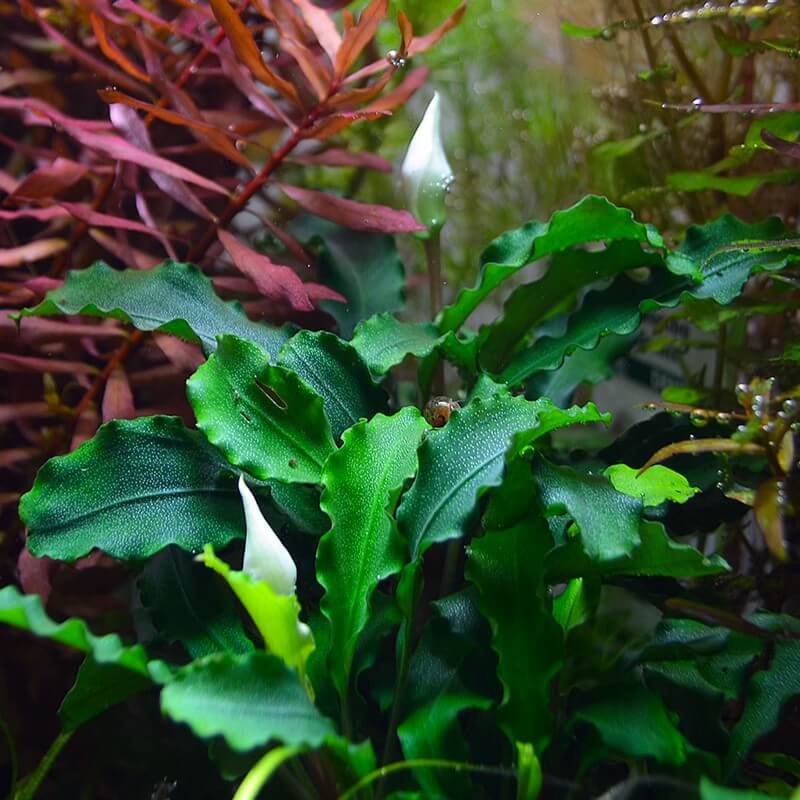Le bucephalandra fleurit régulièrement sous l'eau et offre de superbes fleurs blanches.