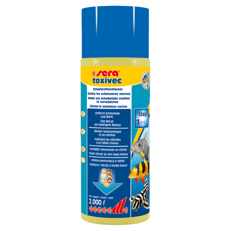 sera toxivec est un conditionneur d'eau qui élimine instantanément le chlore, les chloramines, l'ammonium, l'ammoniaque, les nitrites et empêche l'accumulation de nitrates.
