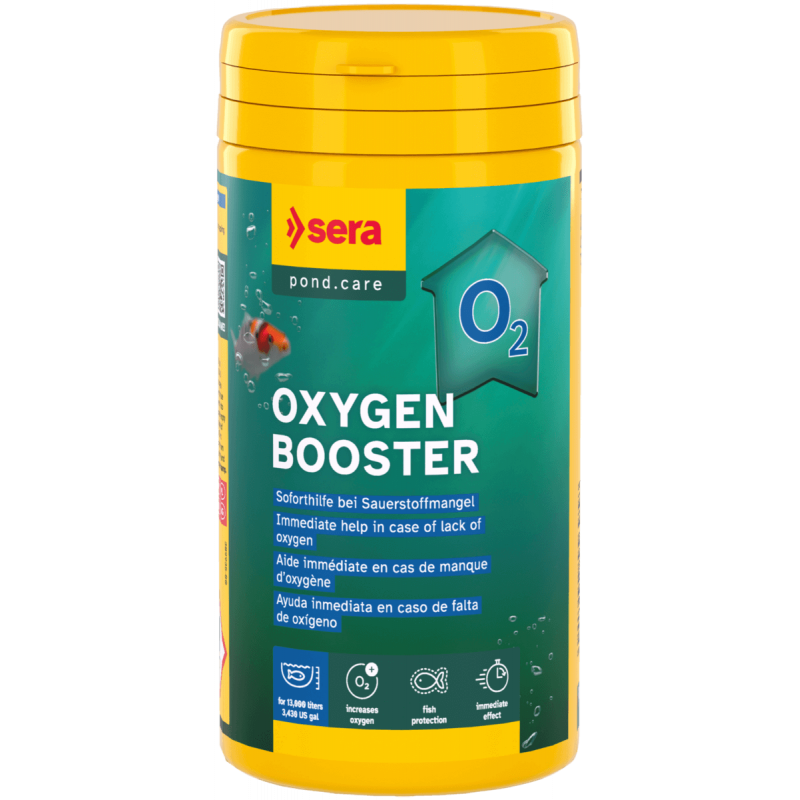 Sera Pond Oxygen Booster 500ml : apport d'oxygène d'urgence pour bassin jusqu'à 25 000 litres. Action immédiate contre le manque d'oxygène, réduit le stress des poissons et prévient l'asphyxie lors des canicules.