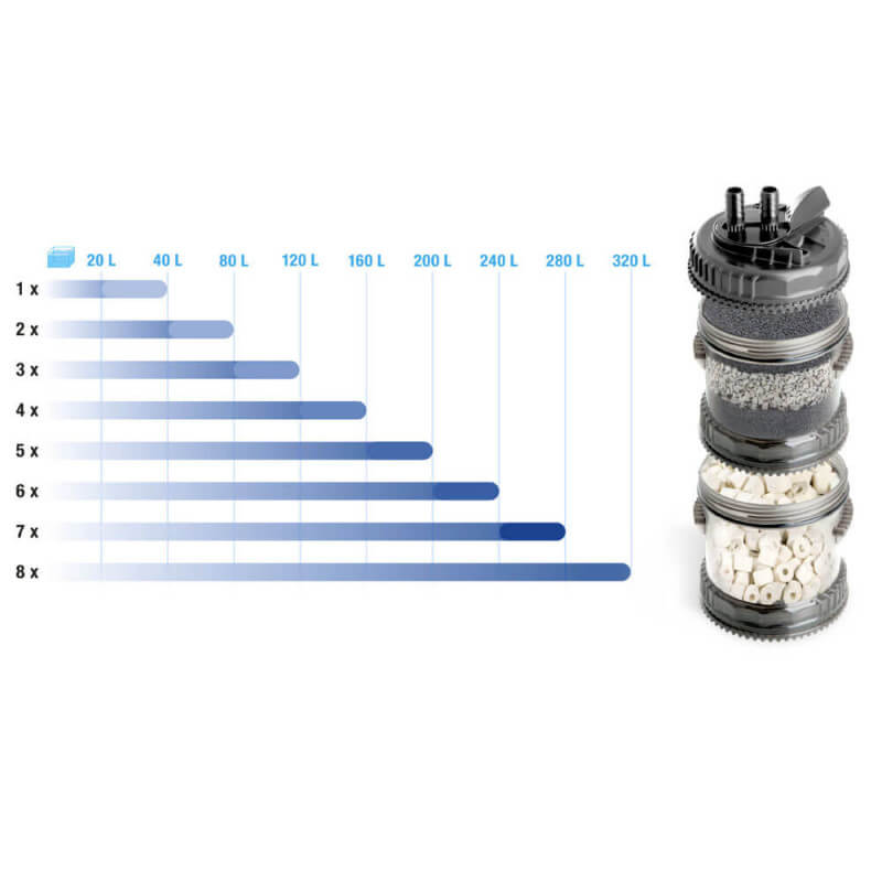 La particularité de ce filtre réside dans sa modularité qui permet d'ajouter des paniers de filtrations suivant le volume d'eau que l'on souhaite traiter. On peut ainsi conserver le même filtre même en faisant grandir l'aquarium.