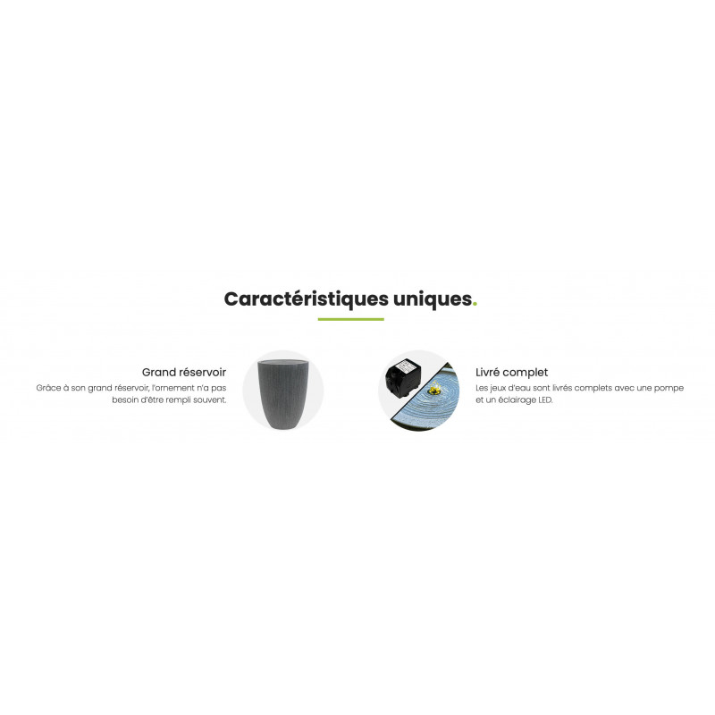 | Type | Fontaine avec pompe et éclairage LED intégré |