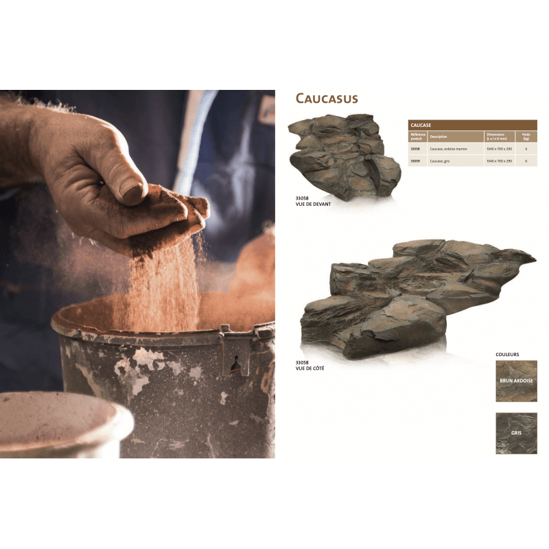 Élément de cascade courbe droite de dimension 1040 x 700 x 290mm (L x l x Ht), pour débit de 3500 l/h couleur pierre, aspect naturel, s’utilisant comme source, milieu de ruisseau ou chute d'eau dans le bassin