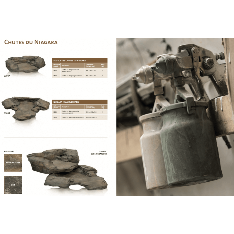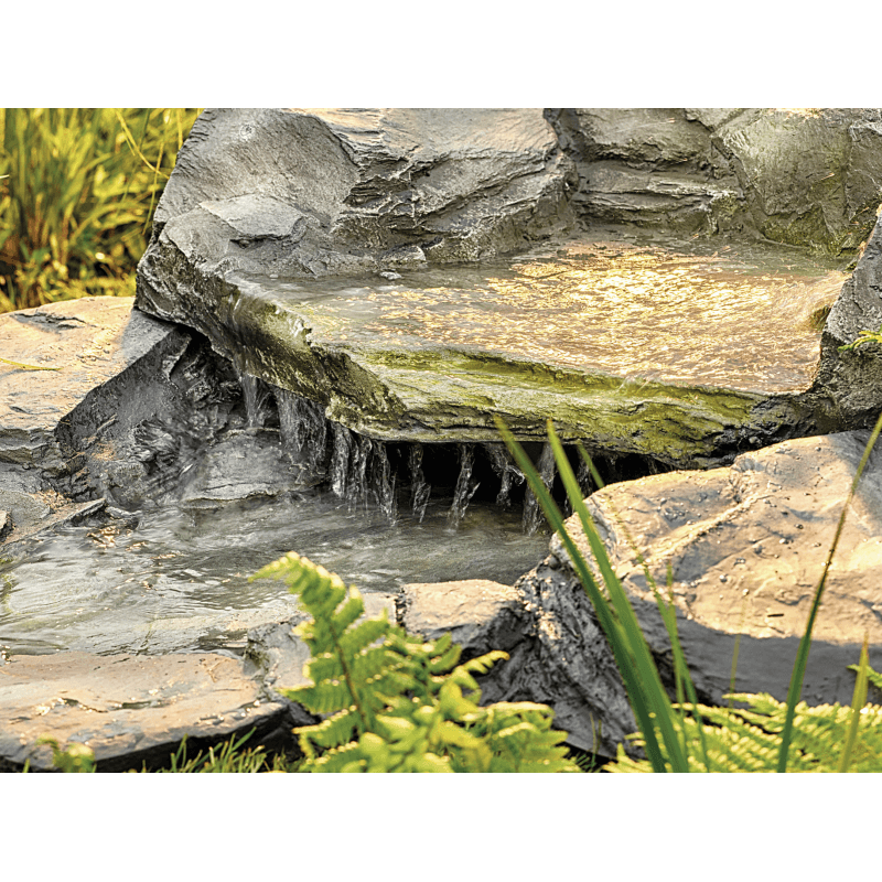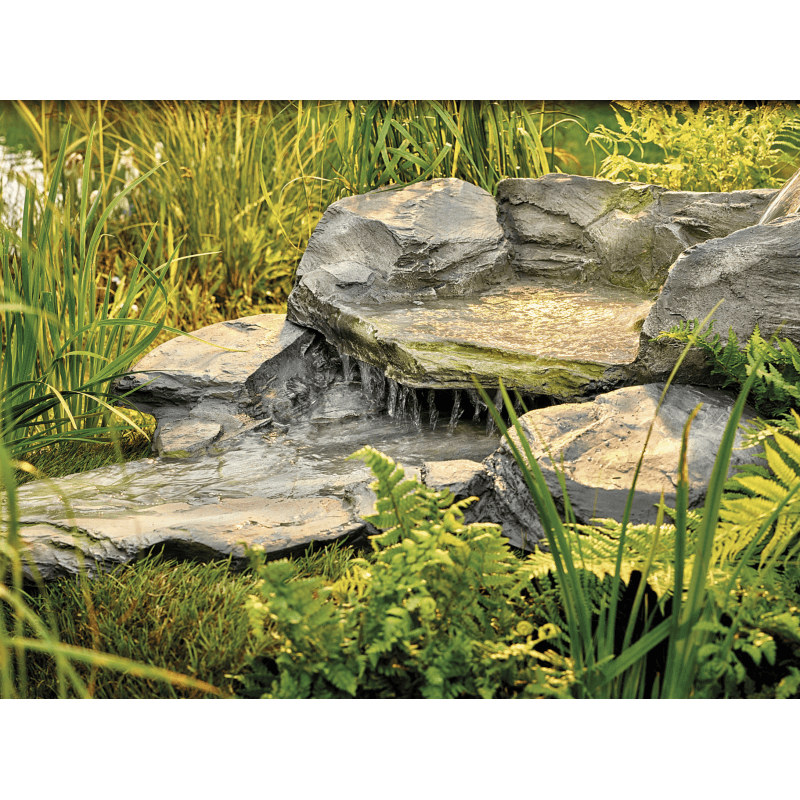 Élément de cascade courbe droite de dimension 800 x 1050 x 120 mm (L x l x Ht), pour débit de 3500 l/h couleur pierre, aspect naturel, s’utilisant comme source, milieu de ruisseau ou chute d'eau dans le bassin.