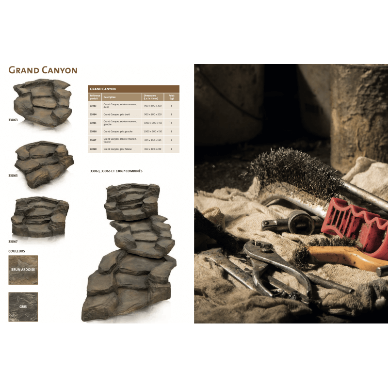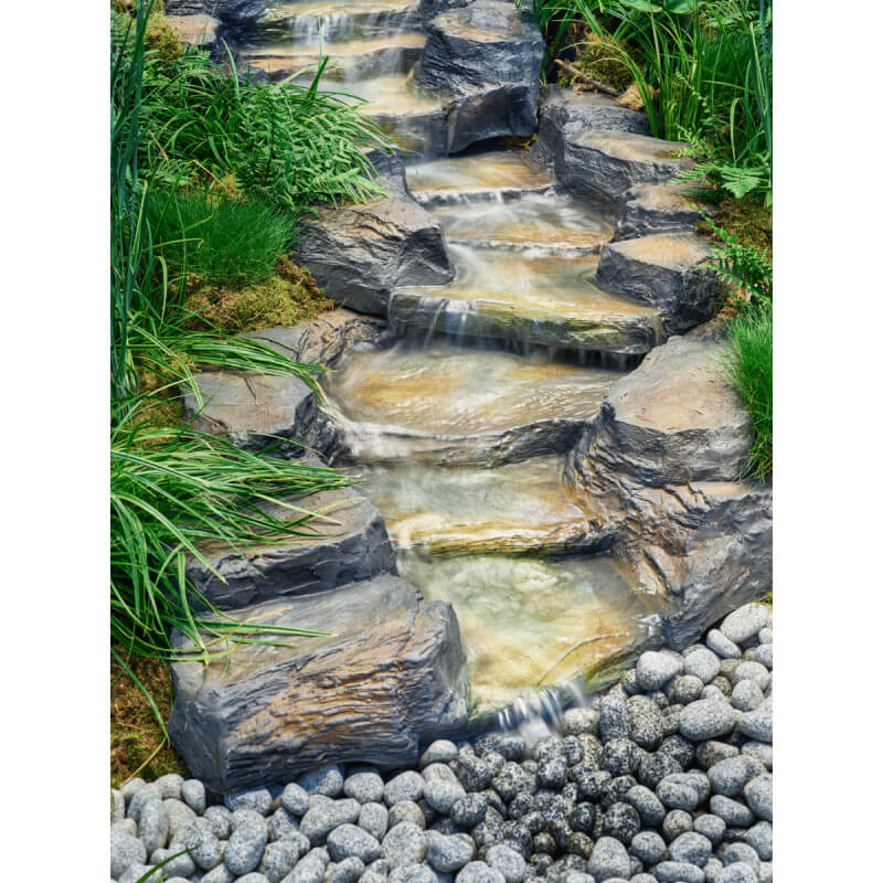 Élément de cascade, de dimension 1000 x 900 x 150 mm (L x l x Ht), couleur pierre, aspect naturel, s’utilisant comme source, milieu de ruisseau ou chute d'eau dans le bassin.