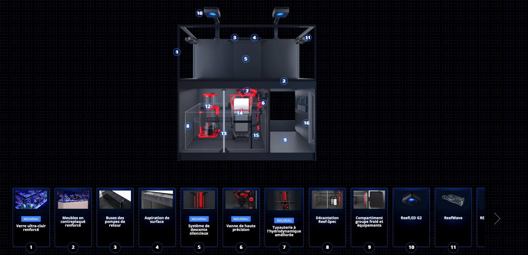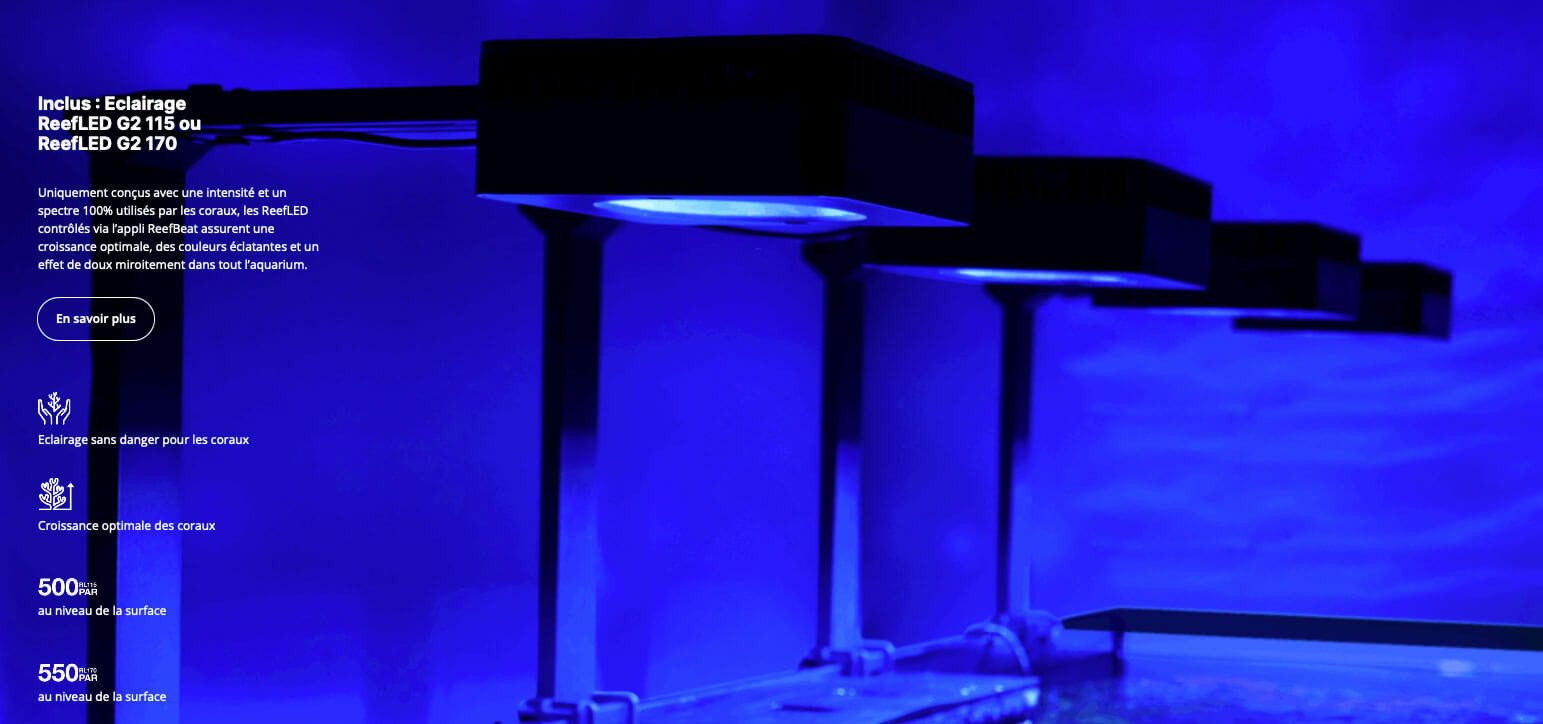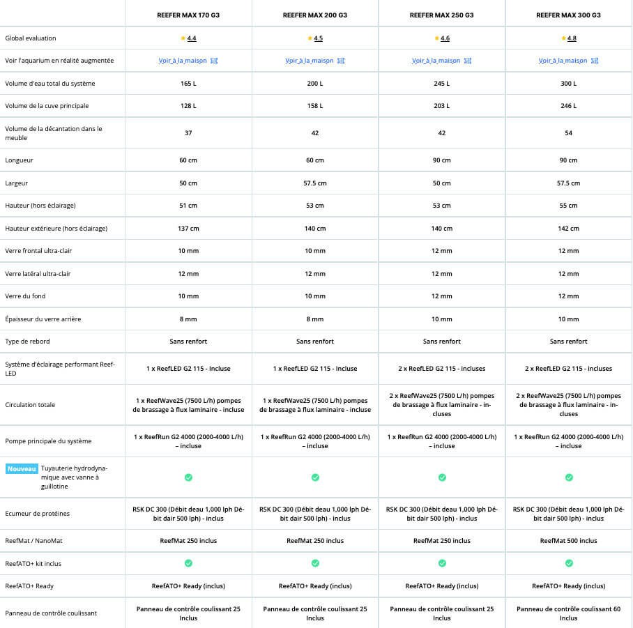 Systèmes Red Sea REEFER™ MAX G3: Ce sont les systèmes idéaux pour le récifal, entièrement équipé avec éclairage ReefLED G2 , Ecumeur, Pompes de brassages , Pompe de remontée , Filtre à rouleaux ReefMat , et osmolateur REEF Ato+ .