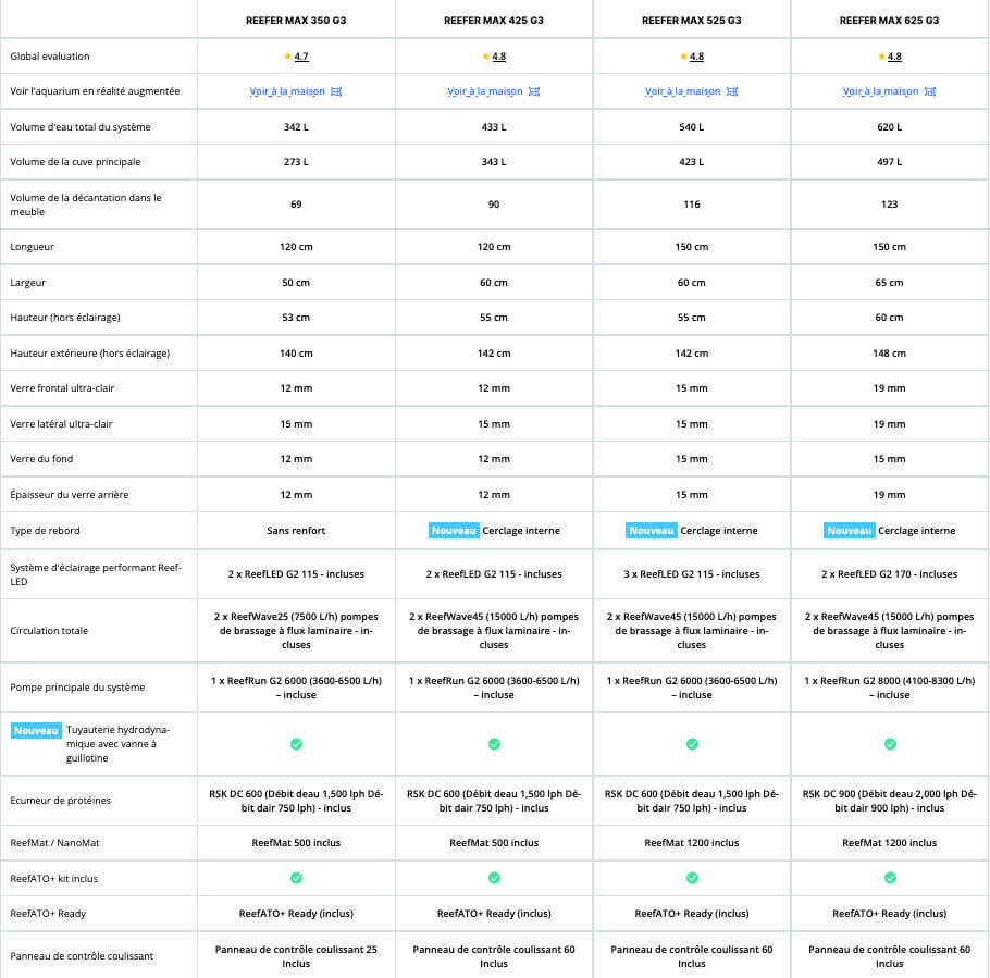 Systèmes Red Sea REEFER™ MAX G3: Ce sont les systèmes idéaux pour le récifal, entièrement équipé avec éclairage ReefLED G2 , Ecumeur, Pompes de brassages , Pompe de remontée , Filtre à rouleaux ReefMat , et osmolateur REEF Ato+ .