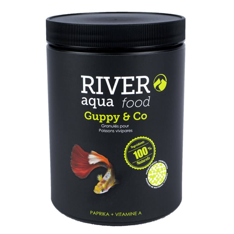 Spécialement formulée pour les guppys et autres petits poissons vivipares, River Aqua Food Guppy & Co propose une alimentation premium en granulés fins semi-flottants.