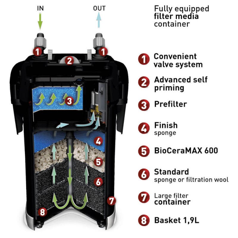 Les filtres Aquael ULTRAMAX sont équipés de plusieurs paniers de filtration en plus du préfiltre.