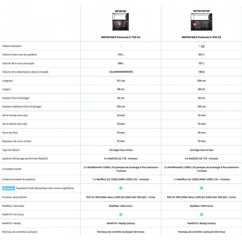 Systèmes Red Sea REEFER™ MAX G2+: Ce sont les systèmes idéaux pour le récifal, entièrement équipé avec éclairage LED , Ecumeur, Pompes de brassages , Pompe de remontée , Filtre à rouleaux ReefMat , et osmolateur REEF Ato+ .