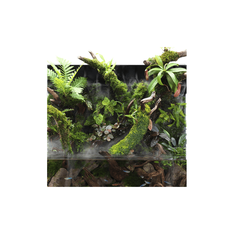 Le mur noir est équipé d'éponges sur lesquelles des plantes telles que des mousses, des fougères et des orchidées peuvent être fixées avec du fil, ce qui facilite la transformation de l'aquarium en paludarium.