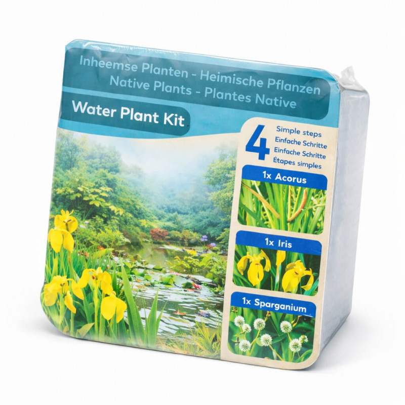Kit complet emballage sec "Theme Natif" : 3 plantes aquatiques indigenes europeennes (Acorus, Iris jaune, Sparganium) + panier 19 cm + terre + gravier. Installation en 4 etapes simples. Plantes robustes et rustiques.