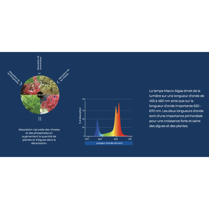 Une grande croissance des algues et des plantes est possible grâce à la production de lumière spécifique avec une longueur d’onde correcte.