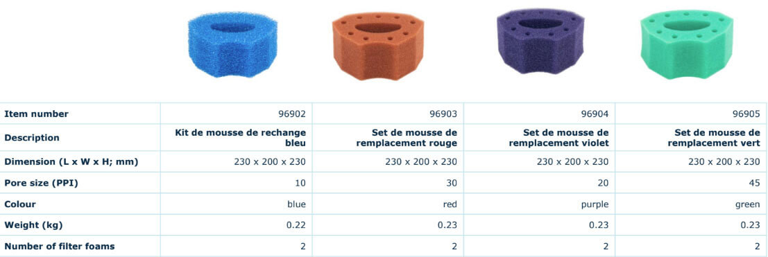 Détail des modèles de mousse des filtres Filtoclear 60/90000: