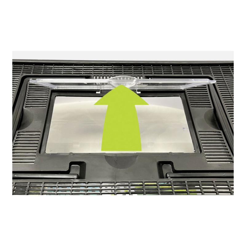 Ce terrarium est équipé d'une poignée et possède une trappe sur le couvercle permettant de ne pas ouvrir totalement le terrarium pour les opérations courantes.